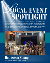 The PTSA Halloween Stomp was a huge success. We had a line out the door the entire 2 hours! Our community donated so many wonderful items and their time. This stomp brought in more money for our PTA than last year and we heard high praises from students, teachers and school staff.