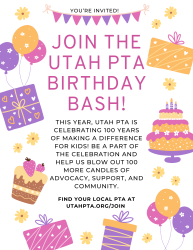 This year, Utah PTA is celebrating 100 years of making a difference for kids! And with that, our theme is Birthday Party. To download and customize your own flyers with this theme, visit the Promotion Aids page.
