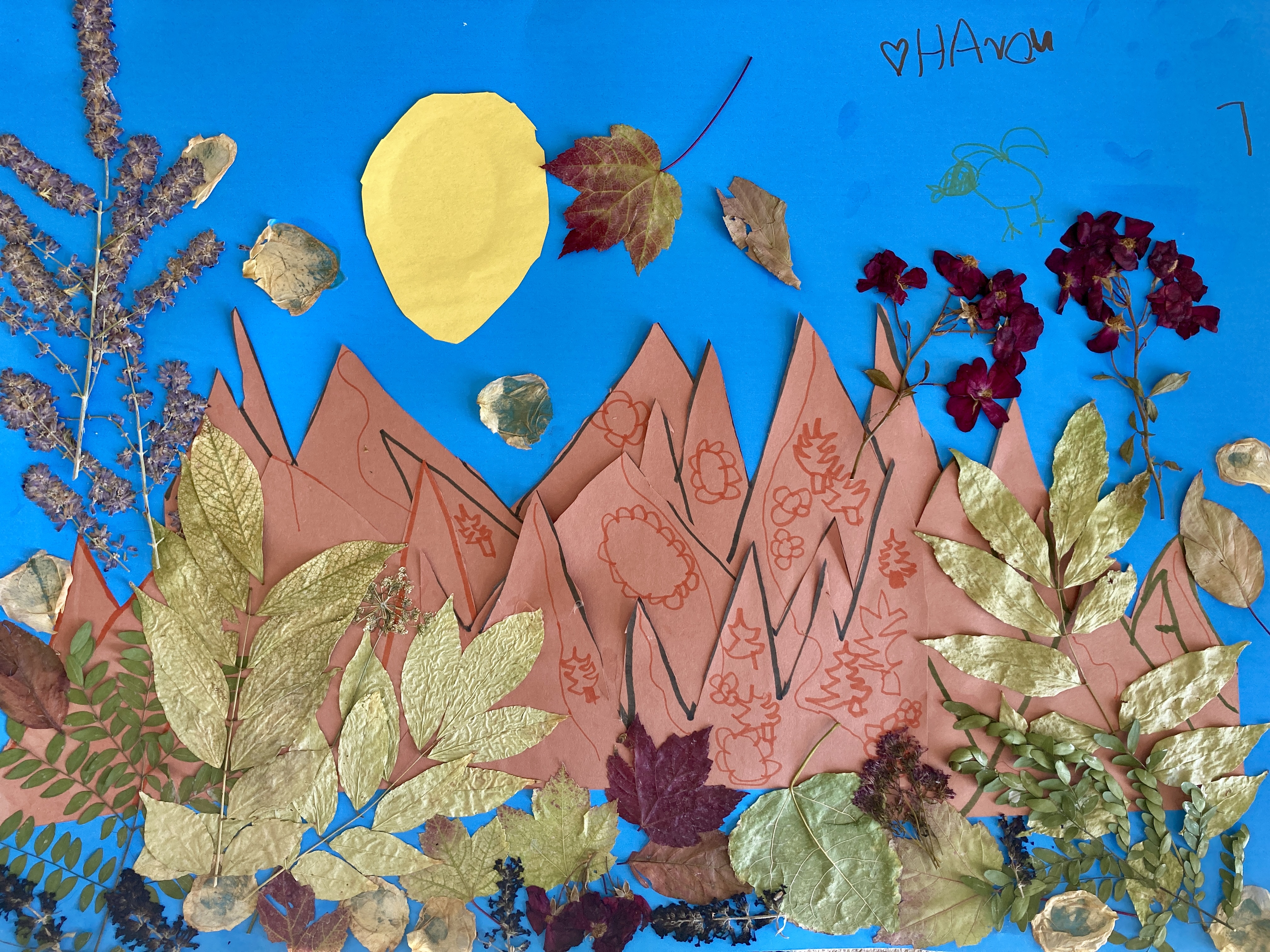 It has mountains on it and plants and a sun! I got the plants outside in my yard. I LOVE collecting nature treasures. I belong in the mountains because I like the mountains. They make me feel good and happy.