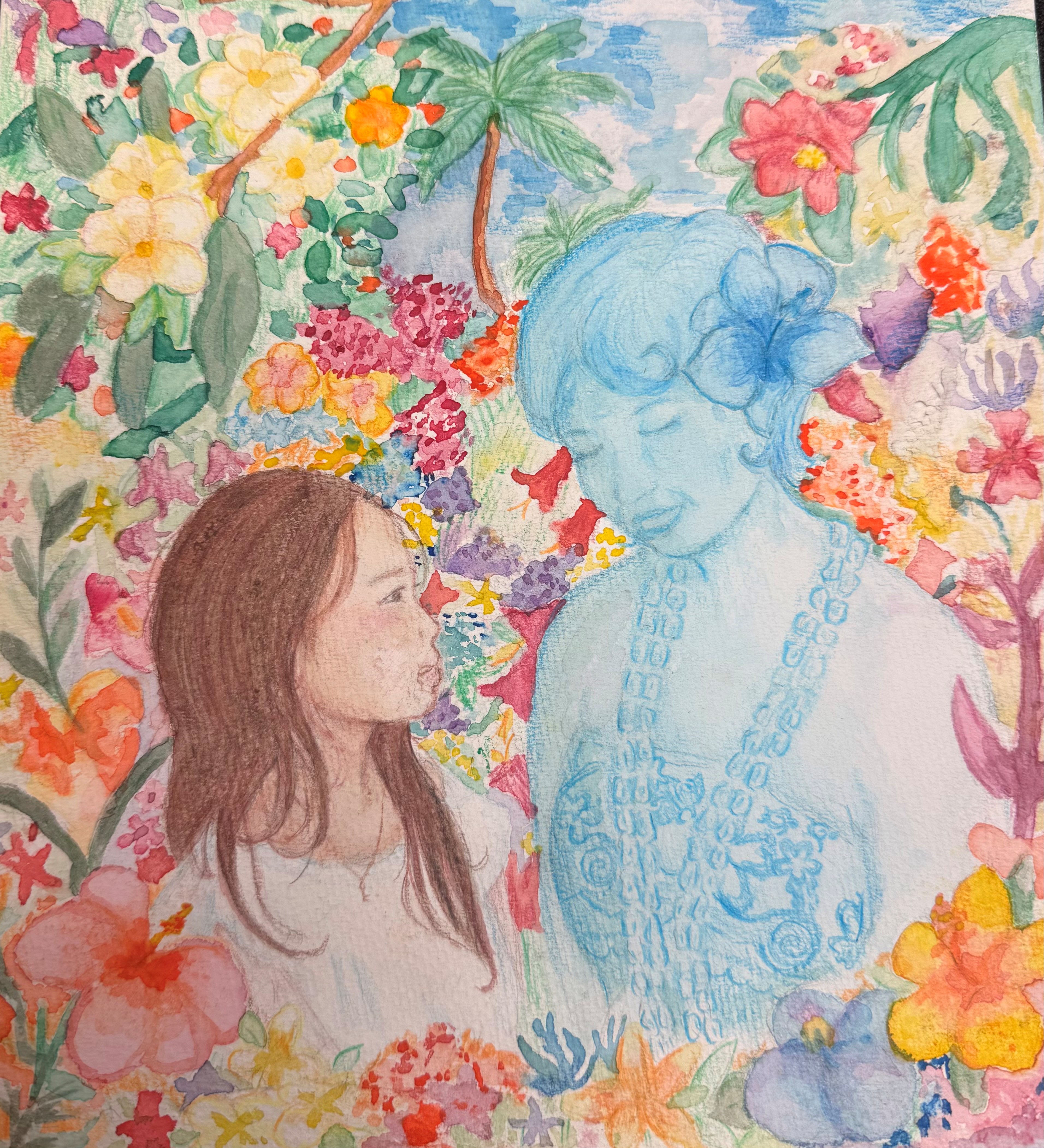 This is a painting that visually represents my family bonds, personal history, and place within a lineage. I was curious to what my grandma did for my dad and his siblings when I was younger; I never got to meet her. The flowers symbolize her love for gardening and flowers; the tropical setting represents Hawaii. My dad and his family lived struggling. They lived in poverty, my grandma was a hardworking, stay-at-home mother of five. She started different at-home businesses for cash. My grandma simply wanted a better future for her children and a better garden; they immigrated to Hawaii.