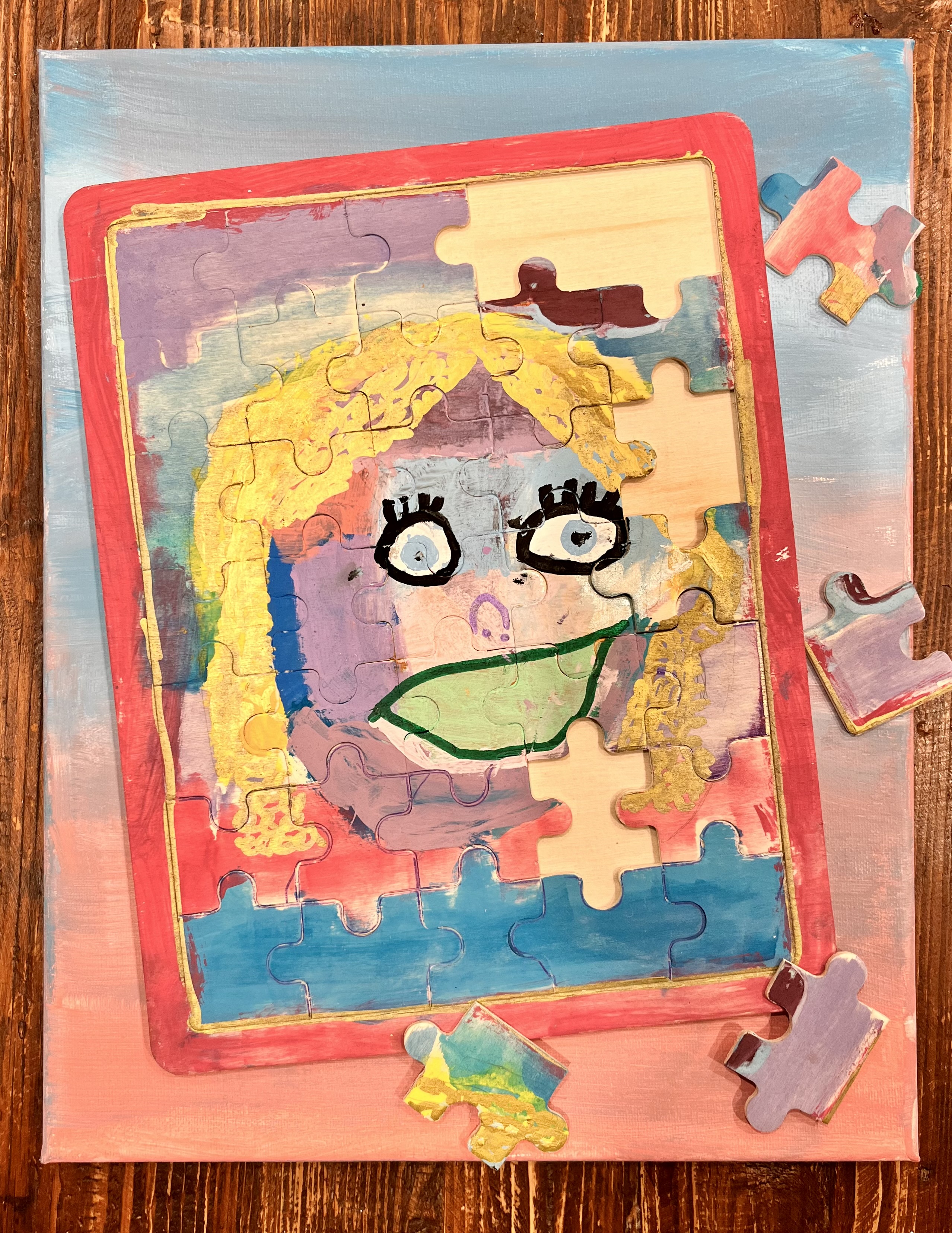I made a puzzle of me and I painted it, then I glued it onto a canvas… Took some pieces out and then glued it on to the canvas. And I made this because no face is perfect and the world might tell us we’re missing something or need a different color, but we can know we’re beautiful just as we are.