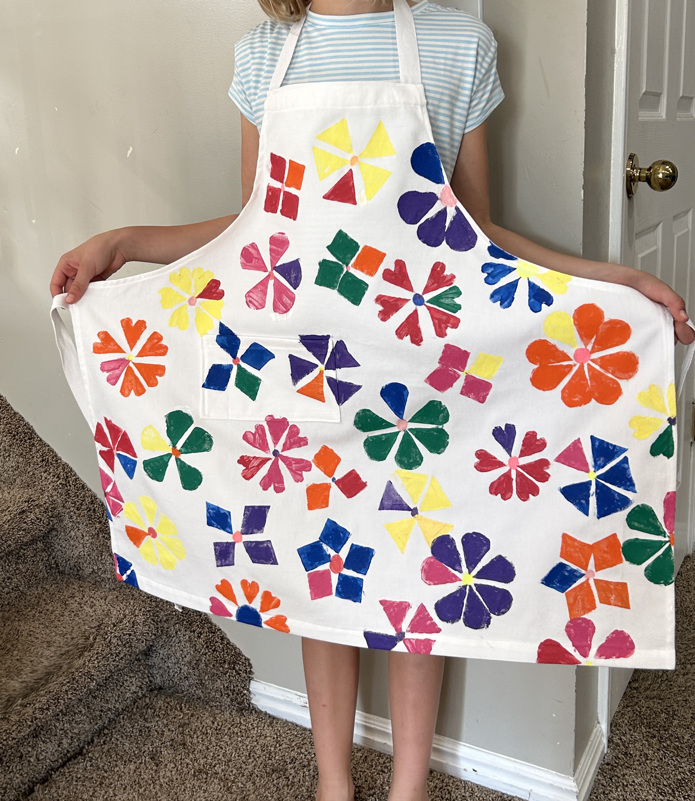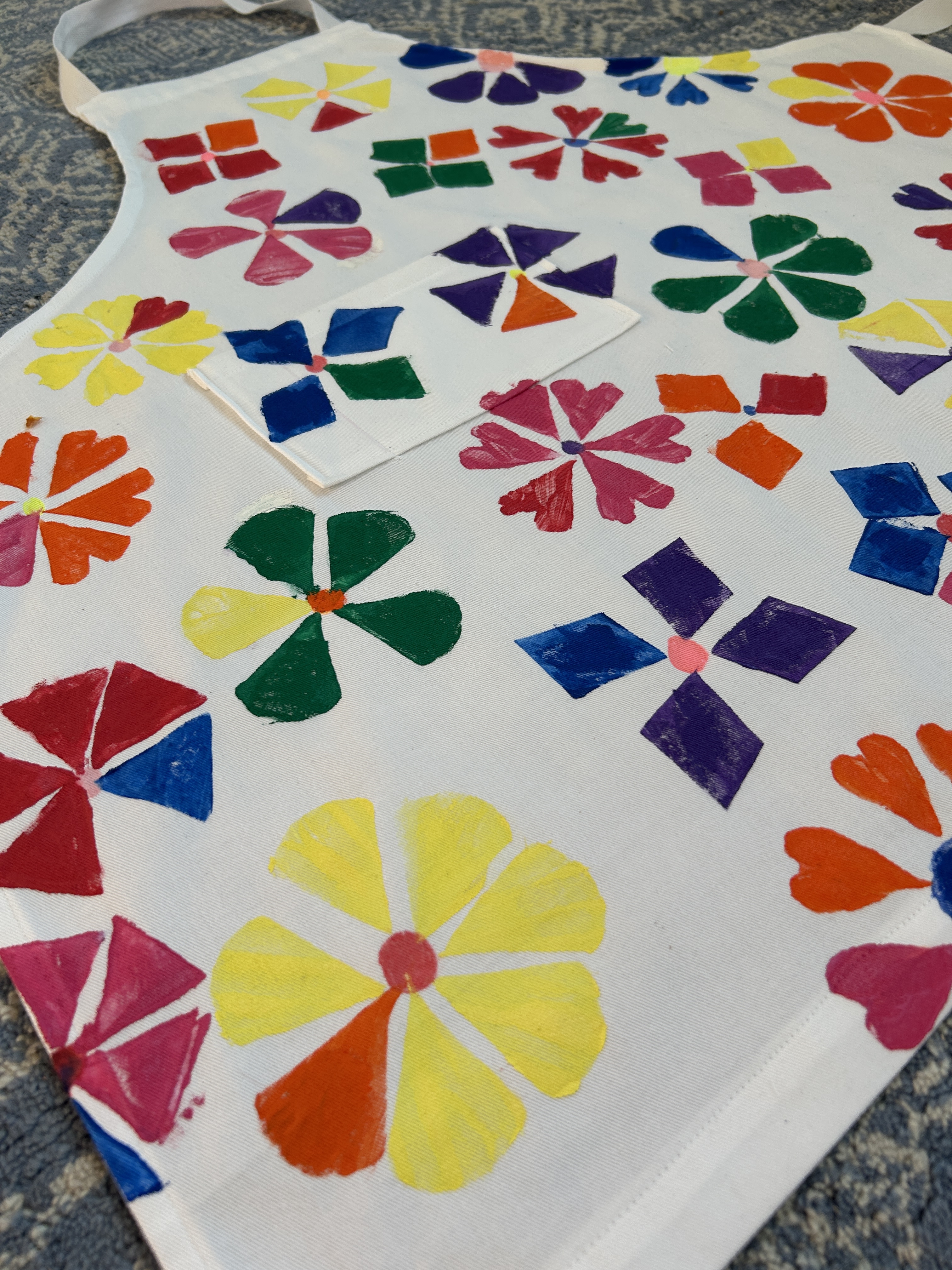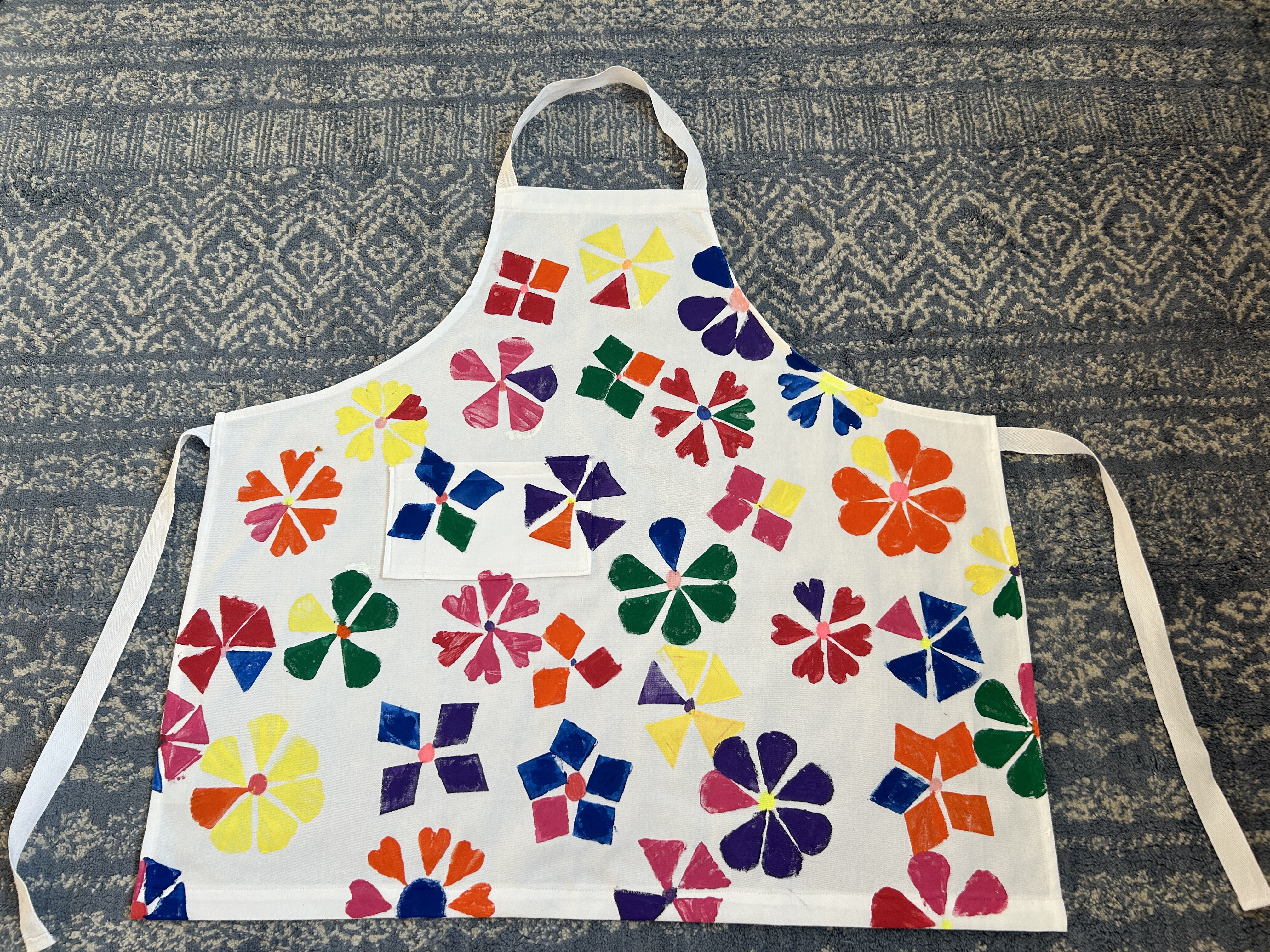 I made an apron because aprons keep you clean and let you be creative and messy. I sewed an apron for the first time. It wasn't perfect but I'm glad I learned a new skill. I painted flowers with pedals on my apron that do not match because we are all different and imperfect. We are not the same. We look different. We have different hair color. We have different eye color. We have different thinking. We have different tastes. We have different things we like. We are all different and we're beautiful that way.