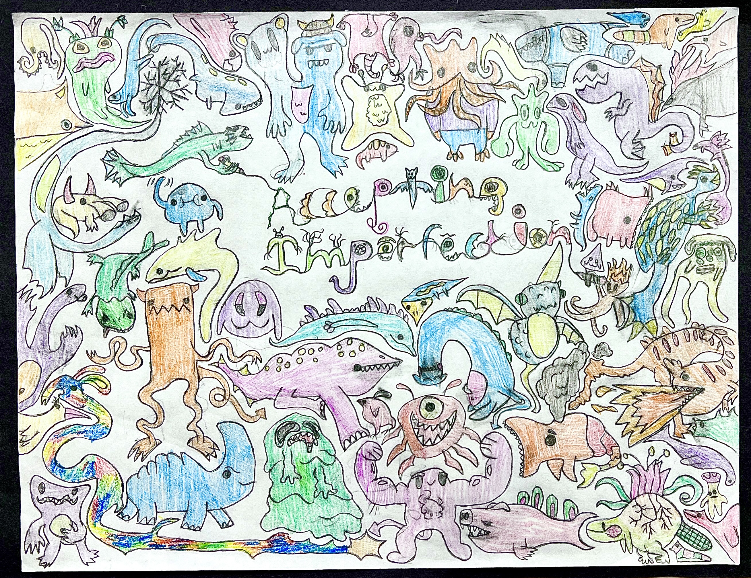 “The monsters in my drawing are just being themselves—they’re all different, and they know they aren’t perfect, and that’s okay. They make mistakes, but that’s part of who they are. If everyone was the same, the world would be super weird. Being different is what makes life interesting.”