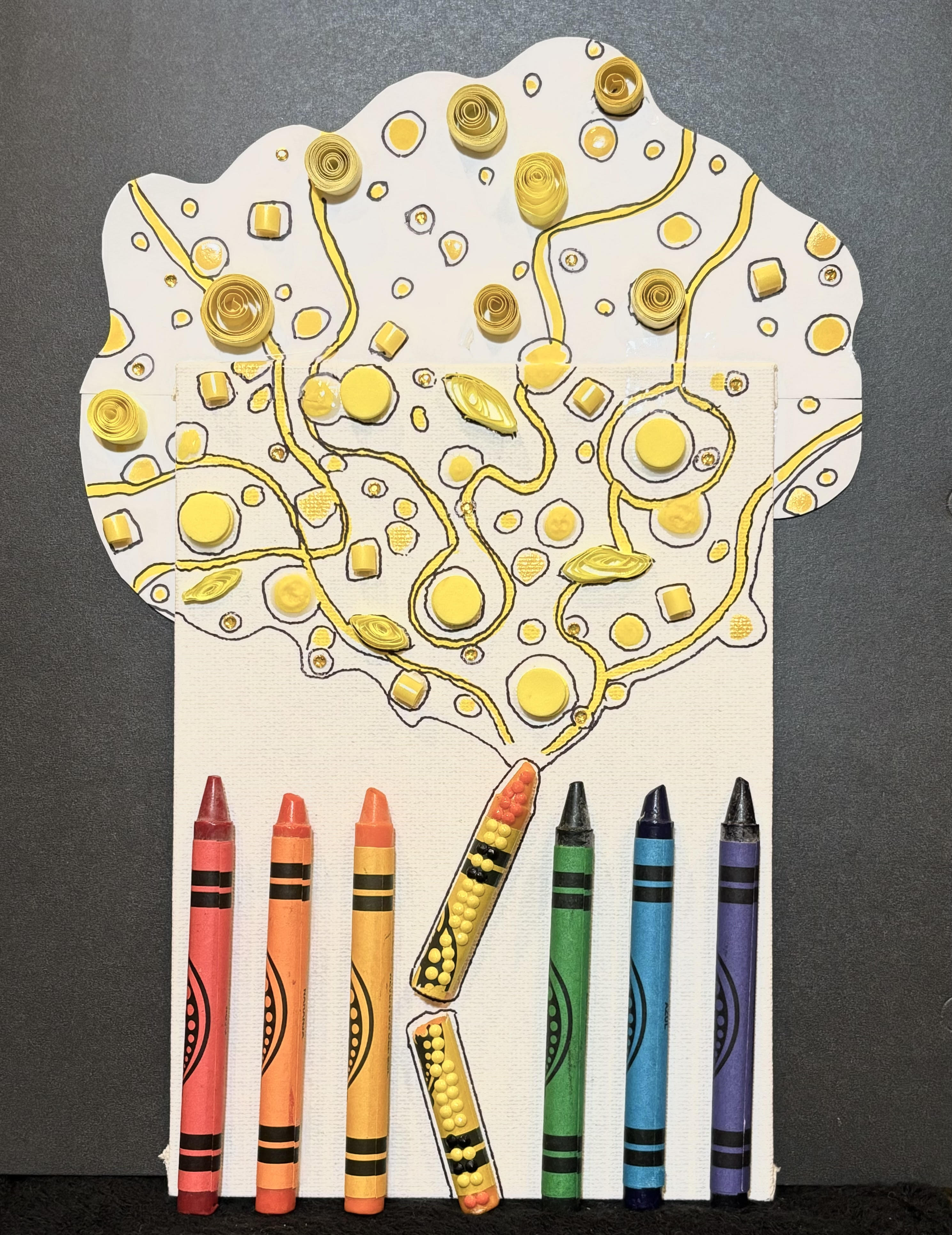 In my artwork, the crayons represent seven different people. The yellow crayon snapped in half because he thought that he wasn’t perfect. Coming out of him is all the beauty and potential he has inside. If we focus on our own strengths we can accomplish great things. We should always remember that even though we all have things about us that are not perfect, there is so much beauty within us.