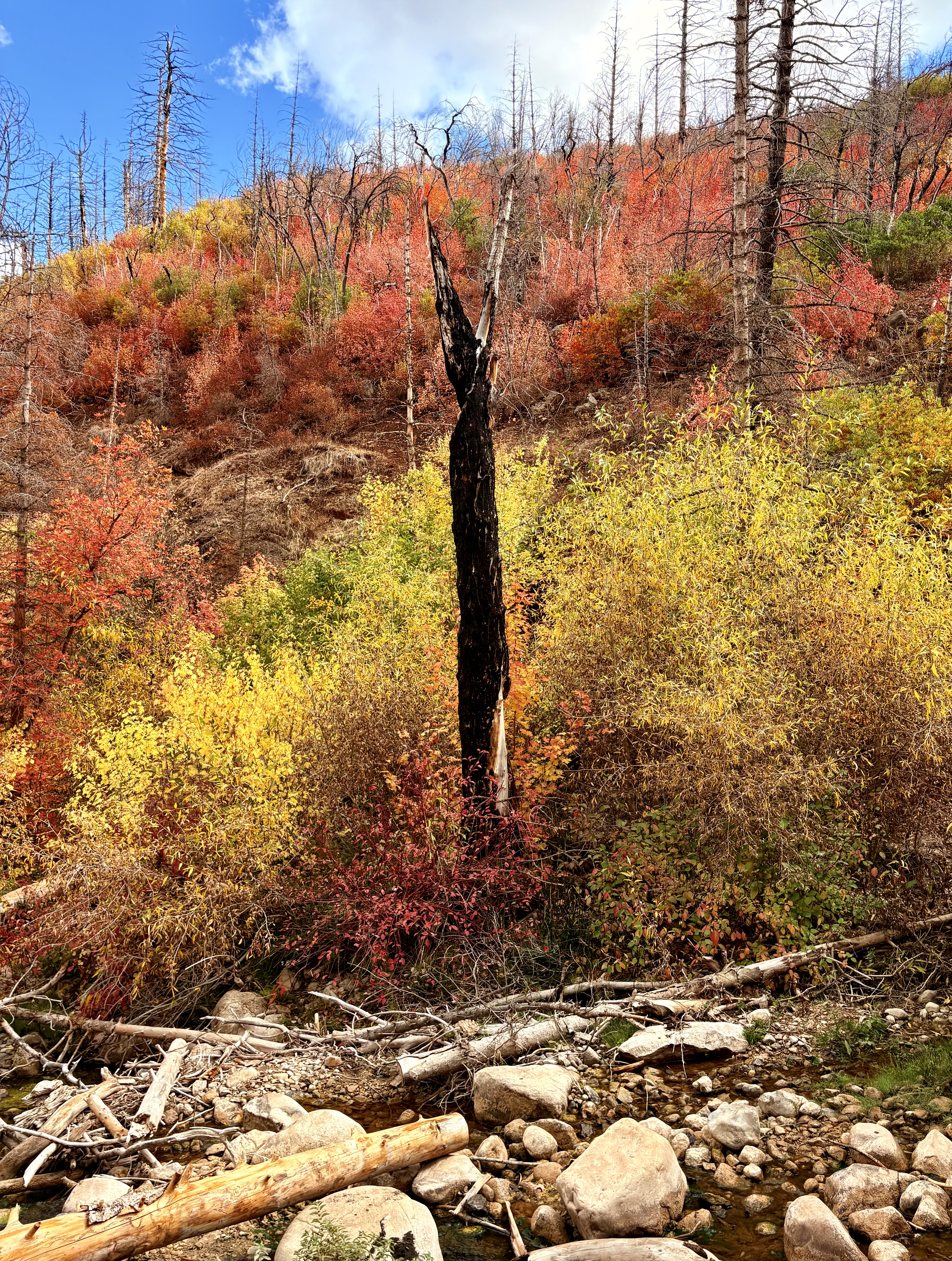I took a picture of a dead tree surrounded by beautiful living plants and leaves. The tree was burned in a wildfire. Even a dead tree belongs in the forest because it can help it's home by giving nutrients and making shelter. Like the tree, sometimes people feel out of place but no matter what you belong. Belonging means that you feel comfortable in your space and other people feel comfortable too.