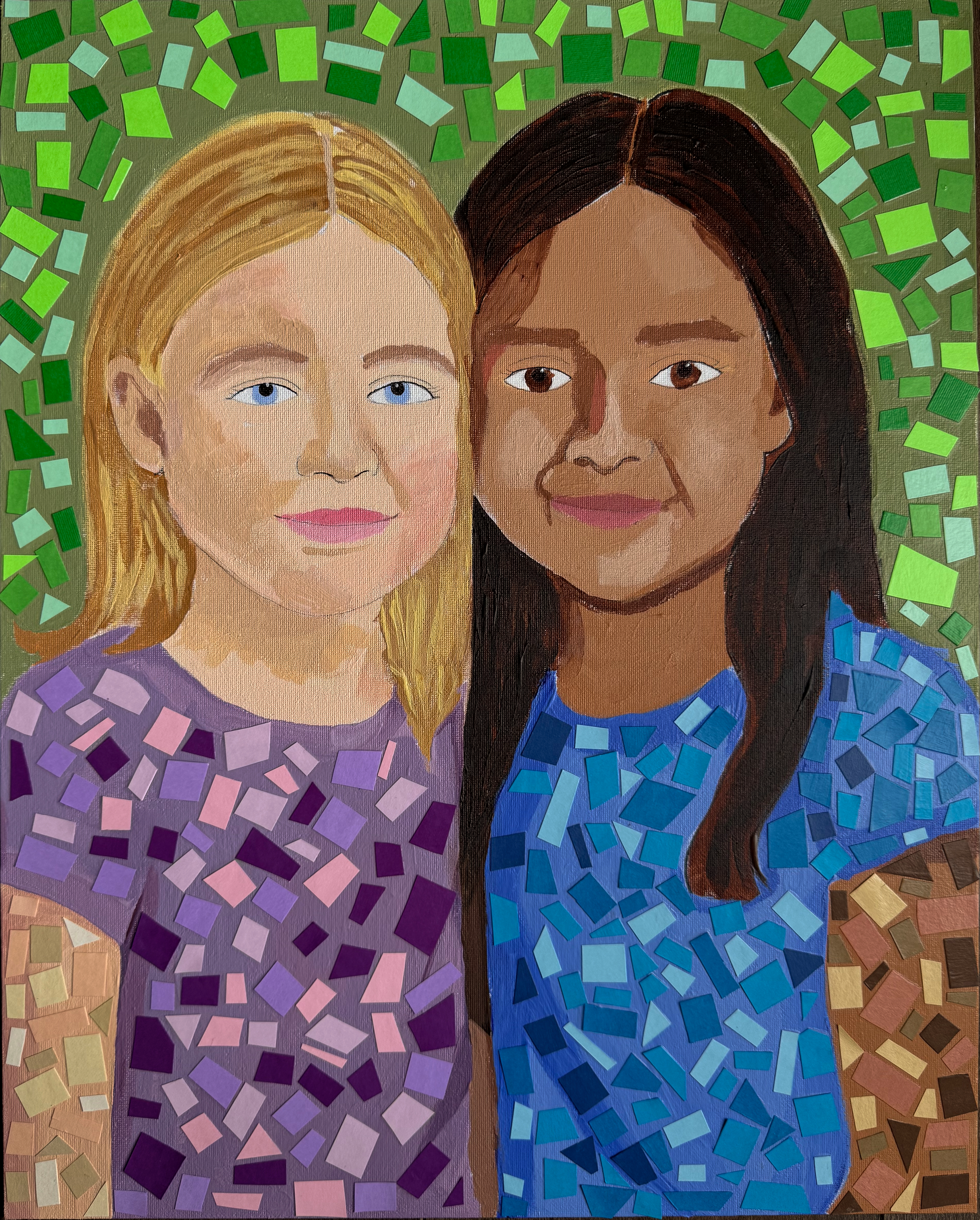 When I was in first grade I didn’t have any friends. Then a new girl moved in. She didn’t speak English, but she was my friend. She helped me know I belong. I made a mosaic which is a bunch of little pieces of paper on a paper. All the pieces of paper are different. Even though they are different, they all look good together.