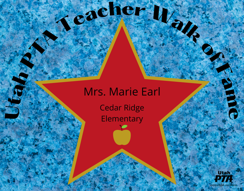 Share this star by clicking the share button above. Add the hashtag #utahptastar and tag the teacher if you can. Invite others to nominate their teachers and help this go viral! Stars are displayed in the Utah PTA Teacher Walk of Fame Gallery and posted on the Utah PTA Facebook page.